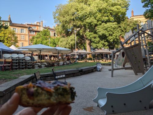 Upon arriving I got a quiche from a local bakery and ate it at a nearby city park/ plaza. I can recall the serene moment of the breeze in the air, the salty salmon in the quiche, and the crying child on the playground calling for his dad because he was afraid to climb higher on a passage of netting.
