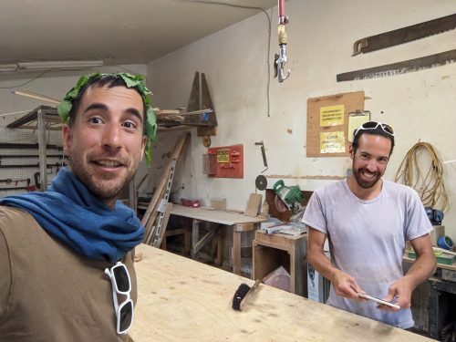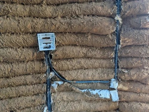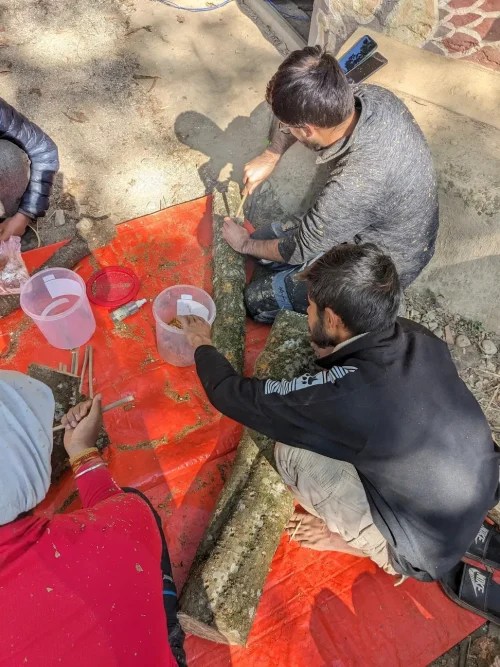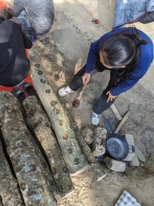 Back at camp, a few volunteers remained. We got started with plastering the inside of the dome with earth. We used an angle grinder to cut holes in the earthbags to insert the skeleton of the electrical system. We also build a scaffold out of bamboo to reach the ceiling. The agriculture team, meanwhile, worked on inoculating chestnut logs with shitake mushroom spores.