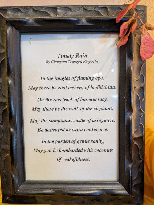 The trip was nice. It is like being in some kind of time warp these past 3 weeks, transitioning from place to place. It calls to mind a quote on groundlessness from Chogyam Trungpa, “The bad news is you’re falling through the air, nothing to hang on to, no parachute. The good news is, there’s no ground.”