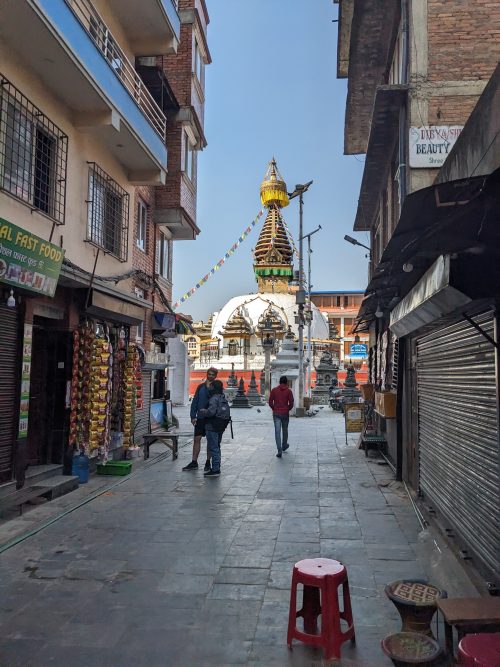 While looking at a Hindu site, I was approached by a man, La Lama, who chatted me up and told me he was a cultural tour guide. He offered to take me to a stupa down the road. He introduced me to different store owners and encouraged me to buy products. I wasn’t interested in accumulating stuff, but I was happy to discuss the rich symbolism in the tanka paintings with him and the shop owners. After looking around the stupa and the shops, he offered to take me to more places, but I declined. I offered him a tip but he refused. He said he wanted more money than I was offering. I didn’t feel like that was justified as most of our interaction was going into shops and asking me questions. He tried a variety of tactics to try to cajole the money out of me. I held my ground and rebutted his arguments on premises of ethics and sale effectiveness. In the end he left angrily.
