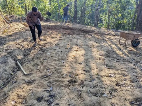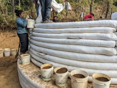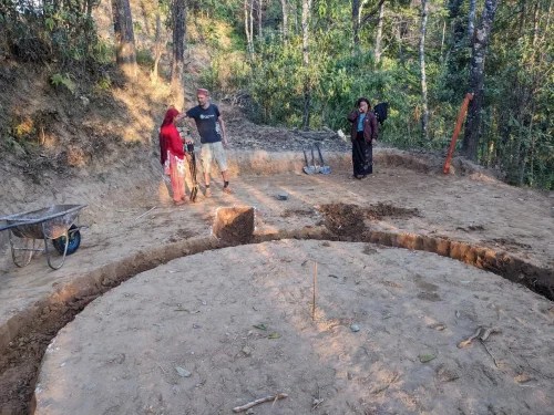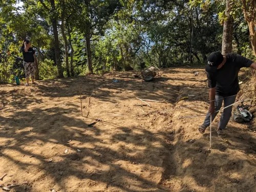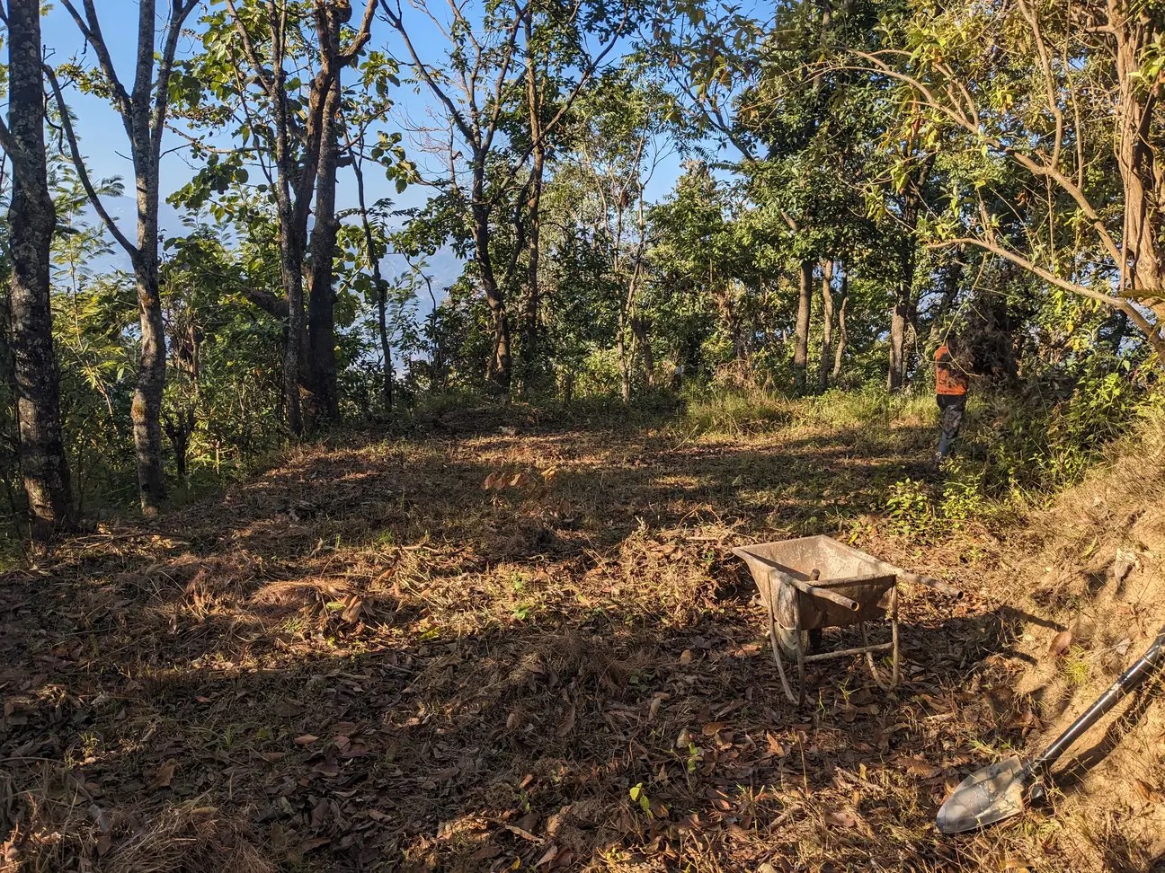 After Tihar, we started working on the foundation. Much of the mountainous land here is divided into terraces. The terrace was chosen and we began by clearing away the top soil. The earthbags must not have any organic matter in them, otherwise it could affect the structural integrity.