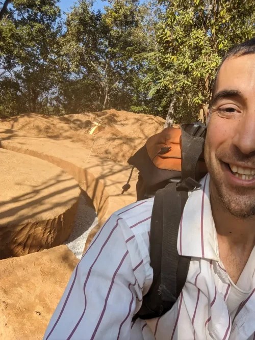 Once lines were marked to outline the earthbags, we dug down 70cm. After being dug we needed to add 30cm of gravel. The gravel was at a higher elevation. There are no roads from the gravel to the construction site, so we had to carry the gravel manually. The locals here carry loads on their backs with a head support. I tried that once and felt pretty uncomfortable. I hate compromising good posture; efficiency is always compromised. I emptied out my backpack, stuffed the polyester sack into it, and transported gravel that way. I was able to carry more gravel, travel faster, and take less breaks.