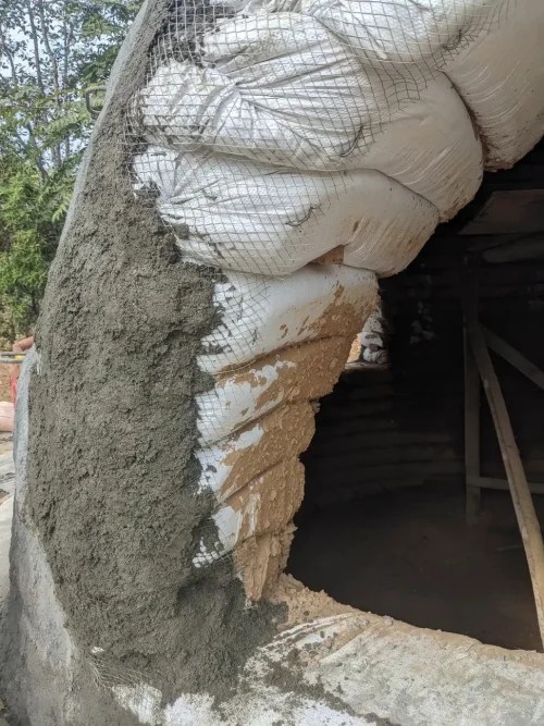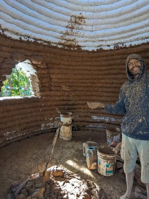 After a magic and memorable New Years, work resumed. We plastered the outside of the dome with cement, perhaps my least favorite, however necessary part of the process. Cement is so much harsher on the skin than earth plaster. The dome top was easy, but the vertical parts had to be covered in wire mesh to catch the plaster. We applied about 3 coats on the outside, then returned to apply additional earth coats on the inside.