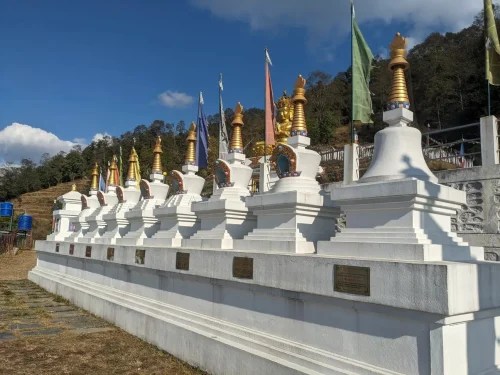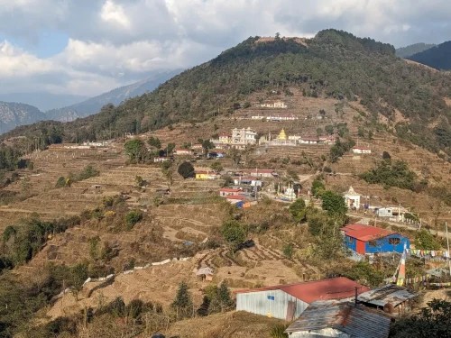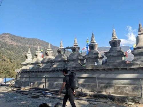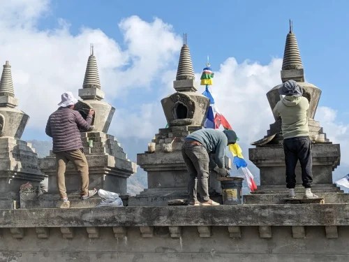 The nights and the morning were met with frost on the ground. The mornings were clear and offered spectacular views of distant snow capped Langtang mountains, one of which looked like the face of an old man staring back. On the way back down, I saw some artisans working on the intricate carvings of little stupas using cement.