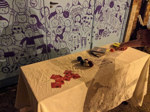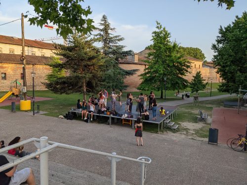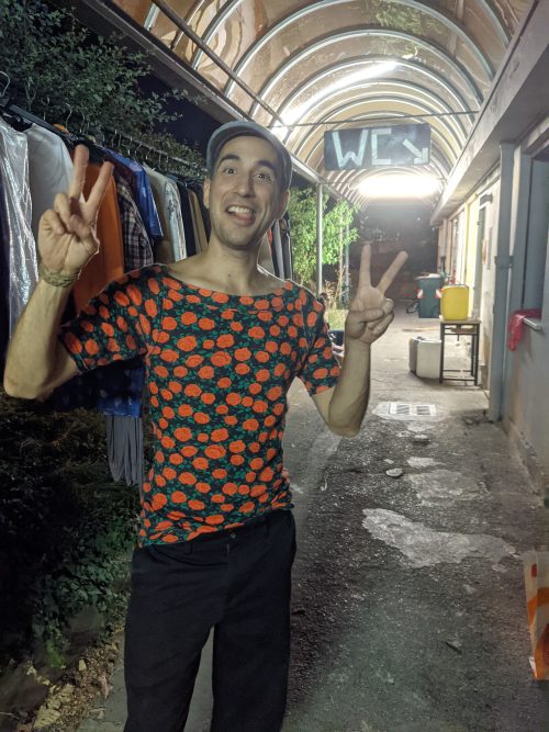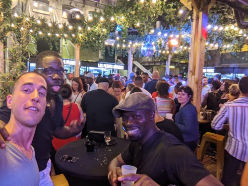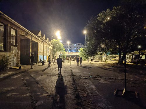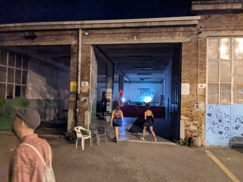 That night we met up with Matteo’s friend, Alexis. Later, we went to this live music performance at this …. place. I don’t know exactly how to describe it. It looked like the parking lot of an abandoned building. It was now a bar/ community events place, with what looked like college furniture, the kind you find on the sidewalk and decide to give a 2nd life to. There was a free clothing exchange next to the bathrooms.